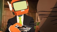 While eating and talking with Kuroiwa, Yamaguchi is then given a piece of sushi with a hidden USB drive by Haruko which ends up infecting him with a virus, causing an alarm to go off throughout the city, he then pulls on a cord found within his stomach and ends up flying away from the restaurant.
