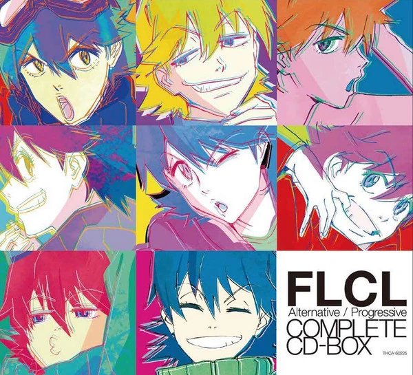 - A CD Box set titled FLCL Alternative / Progressive COMPLETE CD-BOX, featuring a collage of Haruko's face making different expressions.